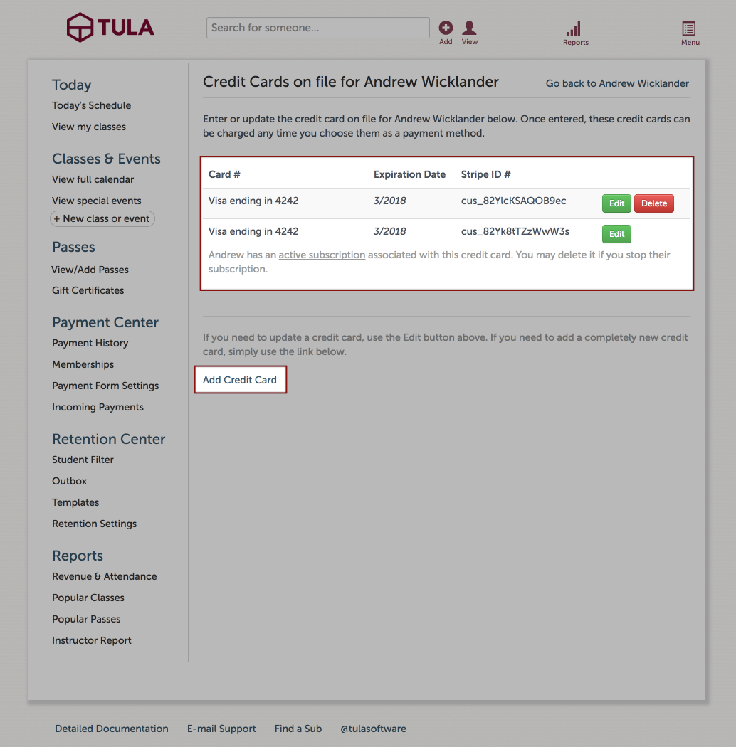 From here you can edit, delete and add new cards. However, if a membership pass is attached to credit card then it will cannot be deleted. If a membership payment is declined or if you want to change the credit card that pays for the membership pass then you have to edit the exsting card and update the detailsl to be the new card.
