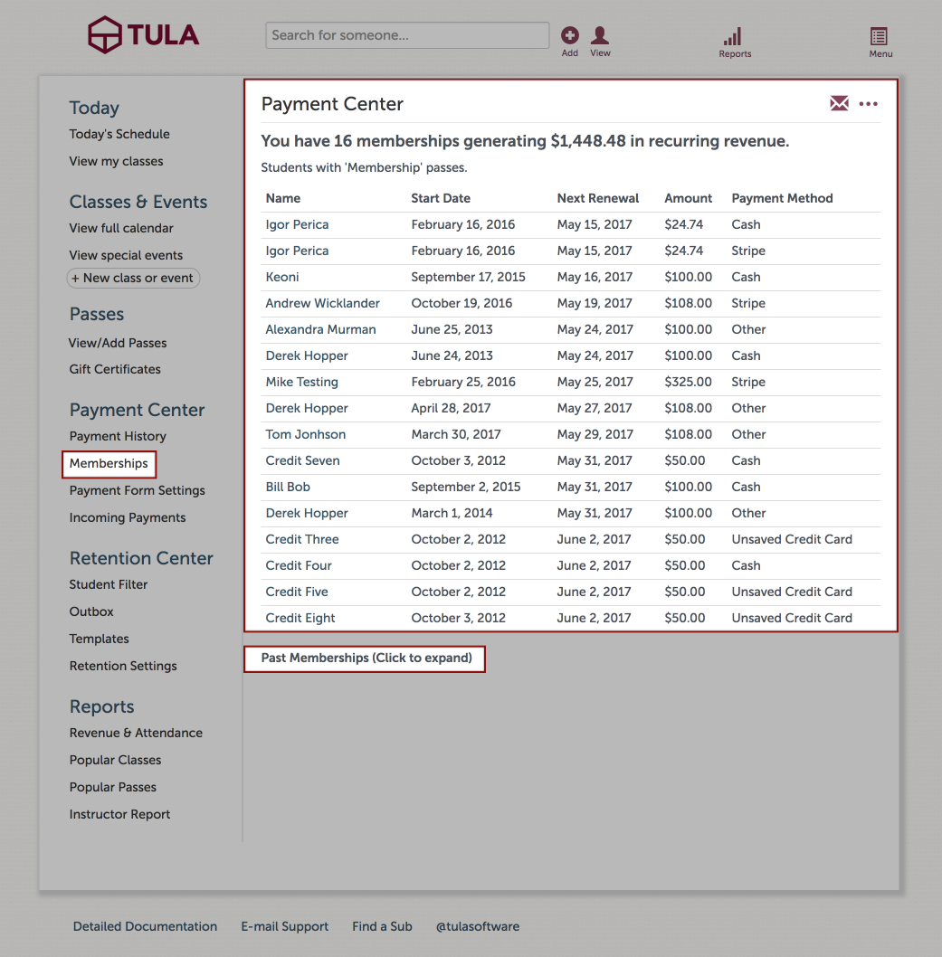 Go to memberships under payment center in the left navigation to view all the students that have purchased a recurring membership to your studio and are still active. At the bottom of this list you will see a link to view all of the past memberships in your studio.